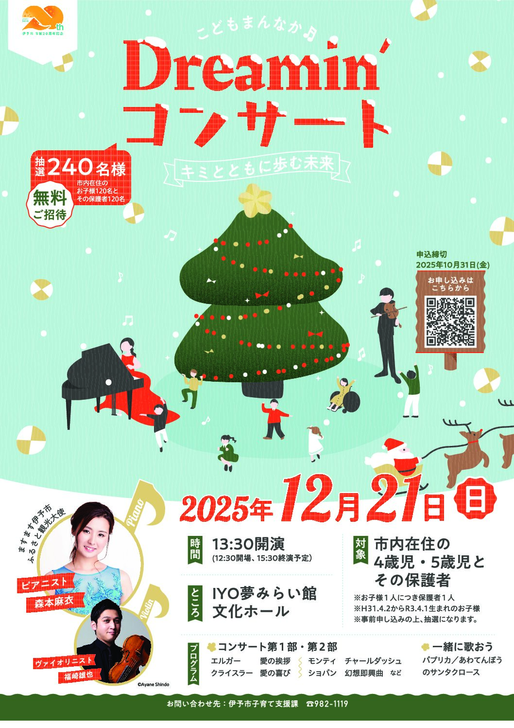 Dreamin’コンサート #あそびば#キャンペーン#子ども#伊予#イベント#子育て2025.09.29 12月21日(日)、ますます伊予市ふるさと観光大使のピアニスト森本麻衣さんらによるコンサートを開催します。一緒に歌いながら、親子で冬の素敵な思い出を作りましょう♪ 市内在住の4・5歳児と保護者が対象で、入場料は無料です。事前申し込みの上、抽選となります。詳しくは公式HPをご覧ください。 抽選の申込みはコチラから。※申込締切は10月31日(金)までです。 いーよ
