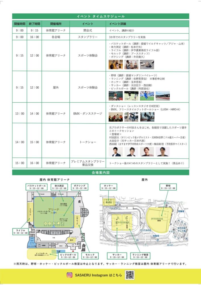 午前中は、バスケットボールやサッカー、ランニング教室、野球体験など9種目が体験可能です。愛媛マンダリンパイレーツの選手や元サッカー日本代表の太田宏介さん、西田剛さんも参加し、直接スポーツを教えてもらうことができます。
