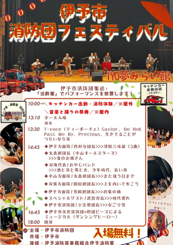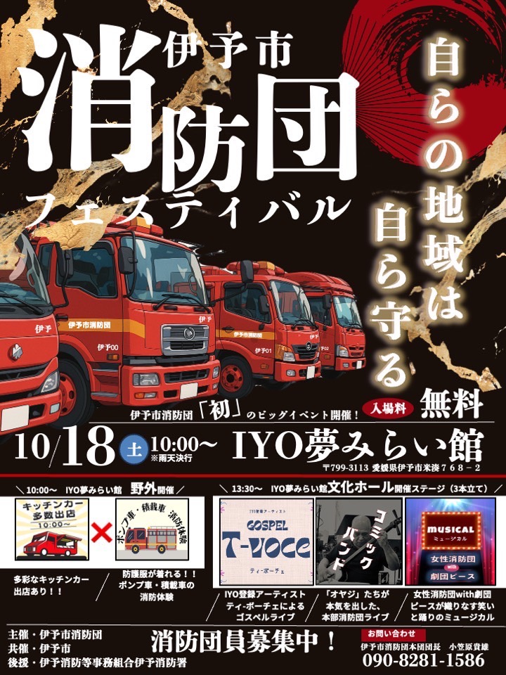 (終了しました)伊予市消防団フェスティバルを開催します! #あそびば#子ども#伊予#イベント#子育て2025.10.12 市制20周年となった伊予市と併せて、伊予市消防団も合併20周年となりました!IYO夢みらい館にて、消防団員が活動の紹介と地域を盛り上げるために消防団によるステージイベントを実施します! キッチンカーや、お子様向けに新型消防団車両での撮影会もあります!消防団員による笑いしかないステージイベントもぜひお楽しみくだい! 日時:10月18日(土)10:00~場所:IYO 夢みらい館入場料:無料 いーよ
