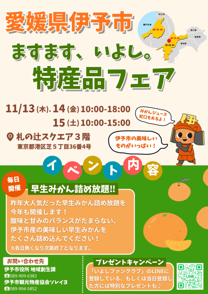 東京の港区にある「札ノ辻スクエア 港区と全国をつなぐコーナー」において、伊予市と港区の連携事業として11月13日(木)から3日間、『ますます、いよし。特産品フェア』を開催します。