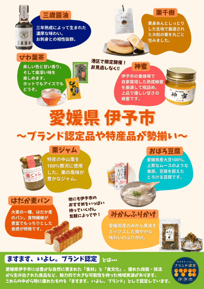 昨年も開催し、好評いただいたこの物産展は、伊予市が「ますます、いよし。ブランド」として認定した産品をはじめ、スイーツや加工品など愛媛県伊予市の特産を関東の皆様へたくさんお届けします。
