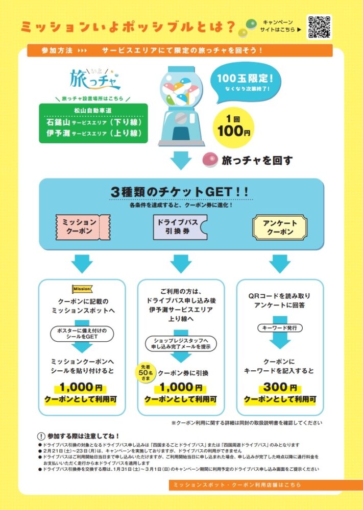 石鎚山(下り)と伊予灘(上り)の両サービスエリアに設置されているカプセル自販機「旅っチャ」を回して、ミッションが書かれたチケットを入手!