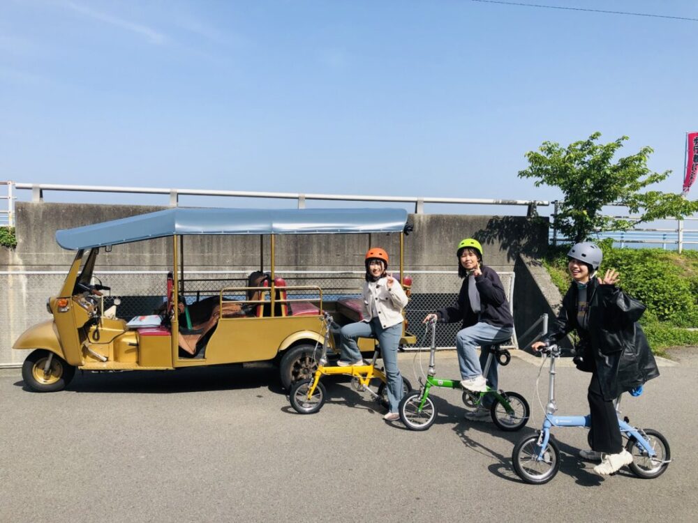 トゥクトゥクではタクシー業務はできないという制約の中で、犬を乗せて海まで走る“わんちゃん便”や、折りたたみ自転車を運ぶ取り組みも生まれました。