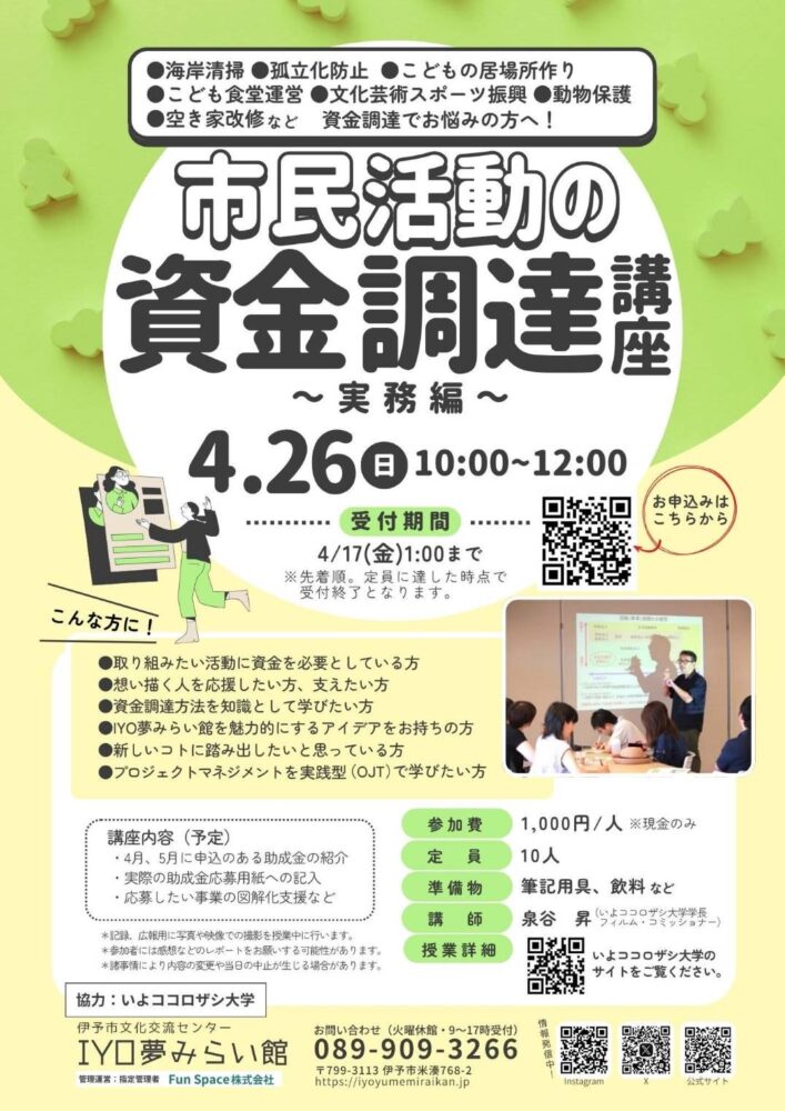 この度、IYO夢みらい館で「市民活動の資金調達講座」が開催されます!