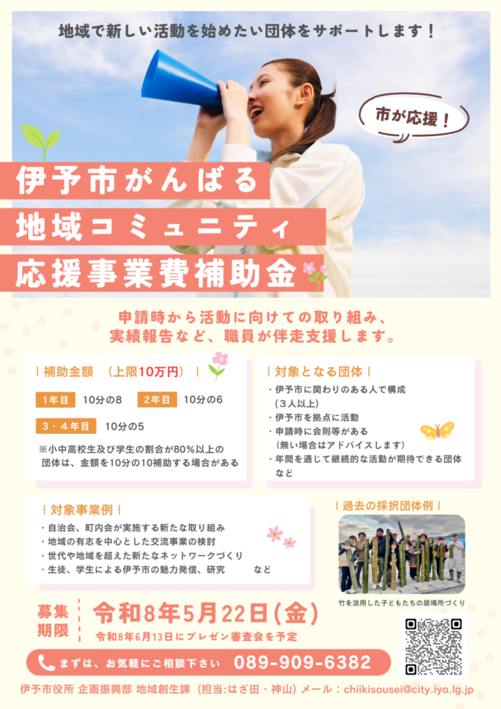 (TEL:089‐909‐6382/E-mail:chiikisousei@city.iyo.lg.jp)までご相談ください!