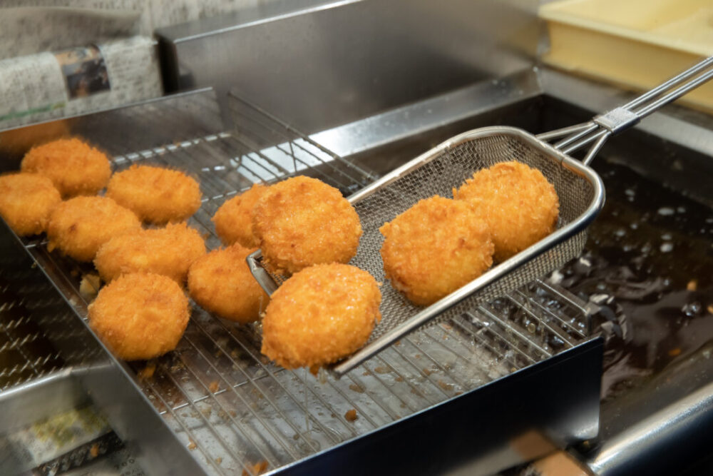 創業以来、手作りの製法で変わらぬ美味しさを生み出しています。人の手で練ることで生み出されるコロッケの“いつもの”ホクホク感、熟練の技で1枚ずつ成型することで生み出されるガンスの“いつもの”プリプリ感。作れる量に限りがあるため、売り切れてしまうこともありますが、それでも“いつもの”美味しさを提供するために1つ1つ丁寧に真心こめて手作りしています。
